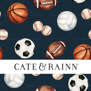 Watercolor All-Star Sports seamless pattern design. Hand-painted soccer ball, football, basketball, volleyball and baseball. Available in multiple background colors!