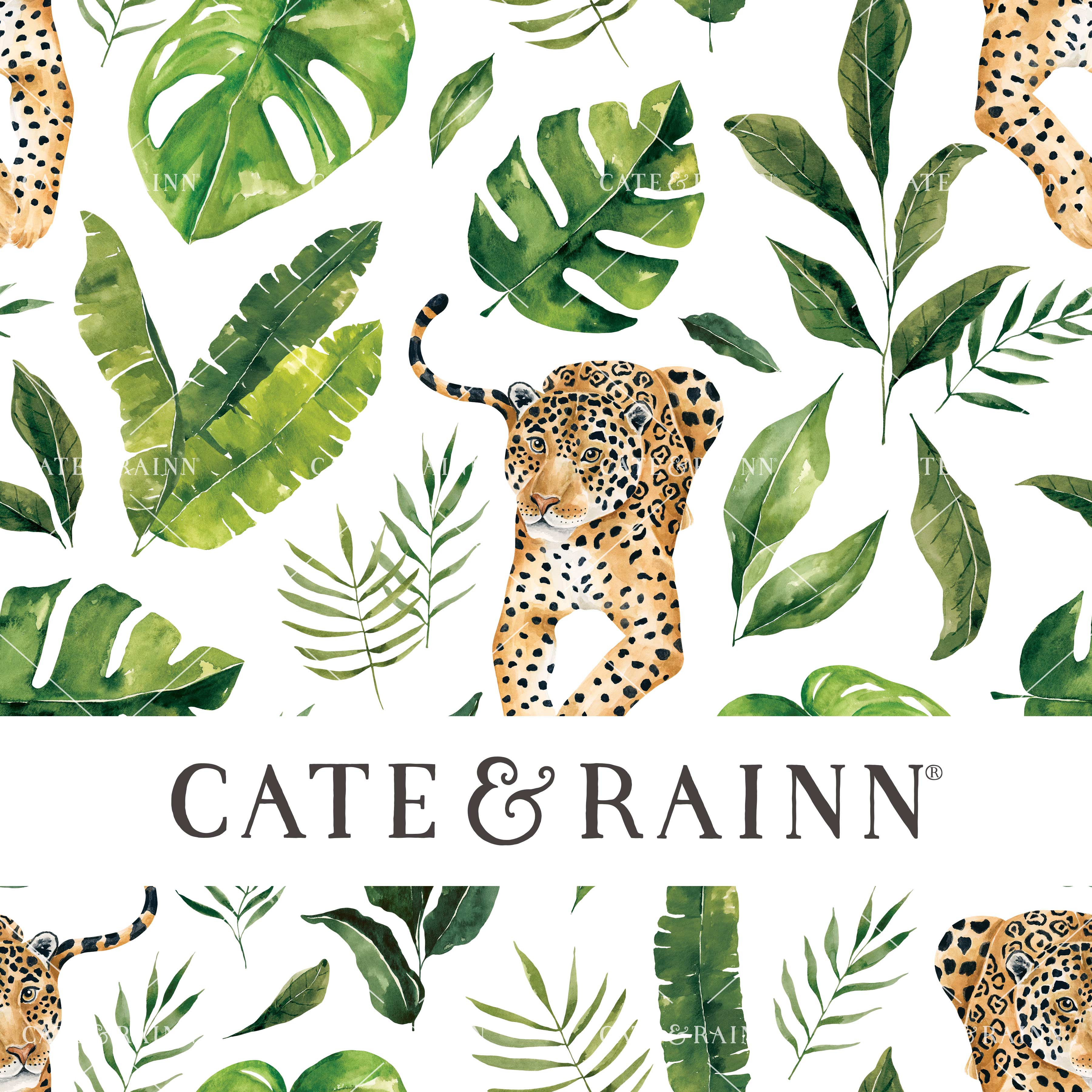 A hand-painted watercolor jungle jaguar pattern design, part of the Tropical Jungle Collection.