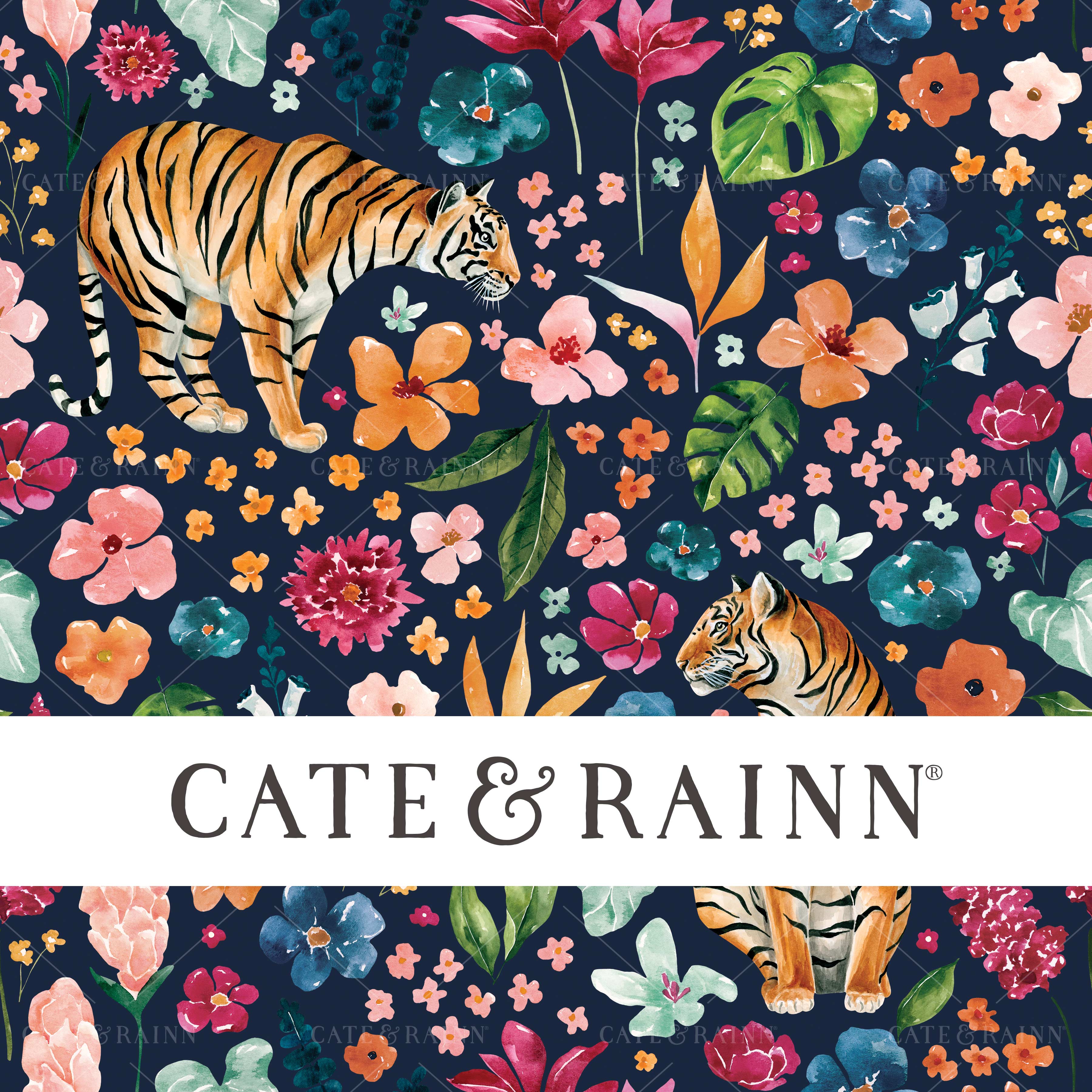 A bold and colorful hand-painted watercolor jungle tiger floral pattern design, part of the Tropical Jungle Collection.