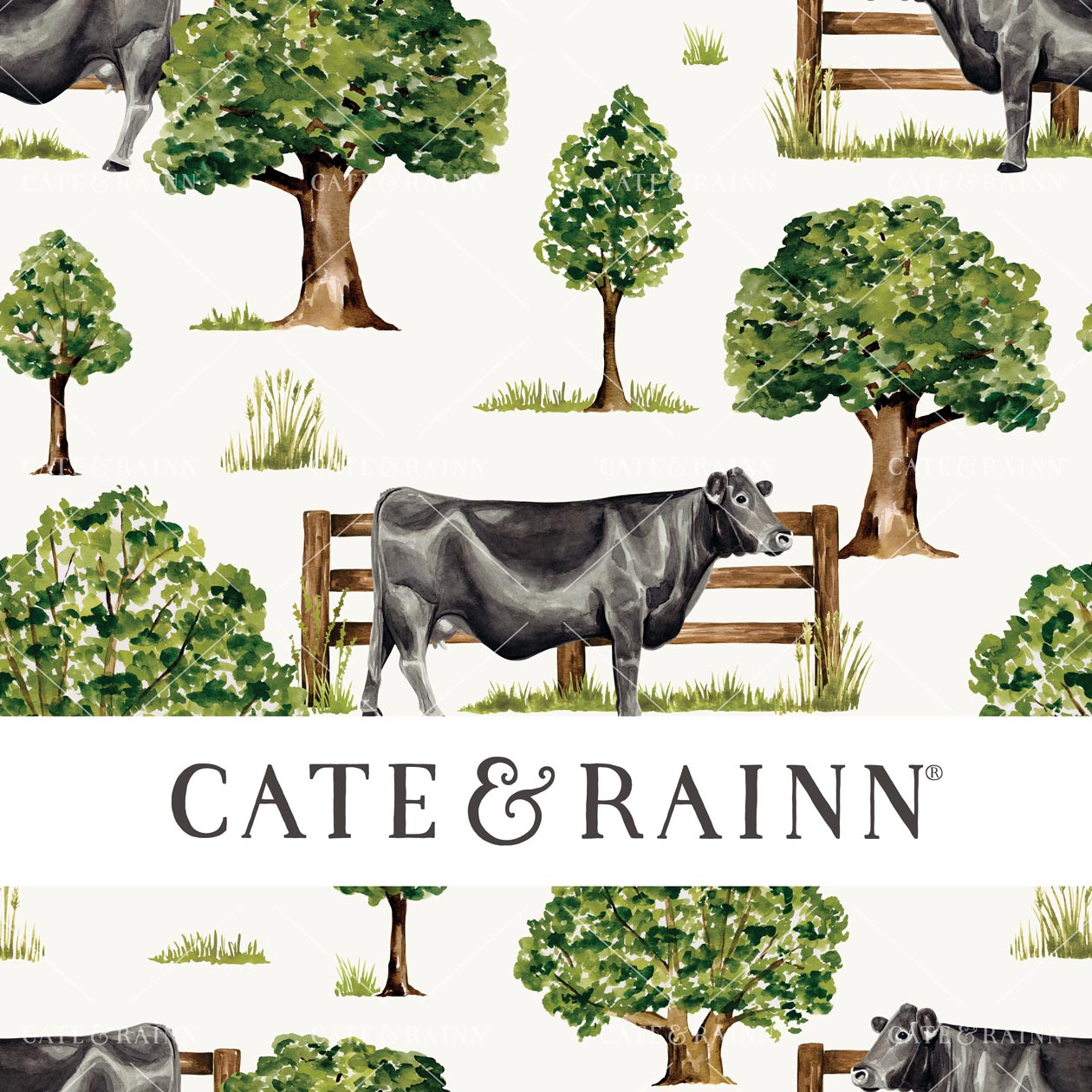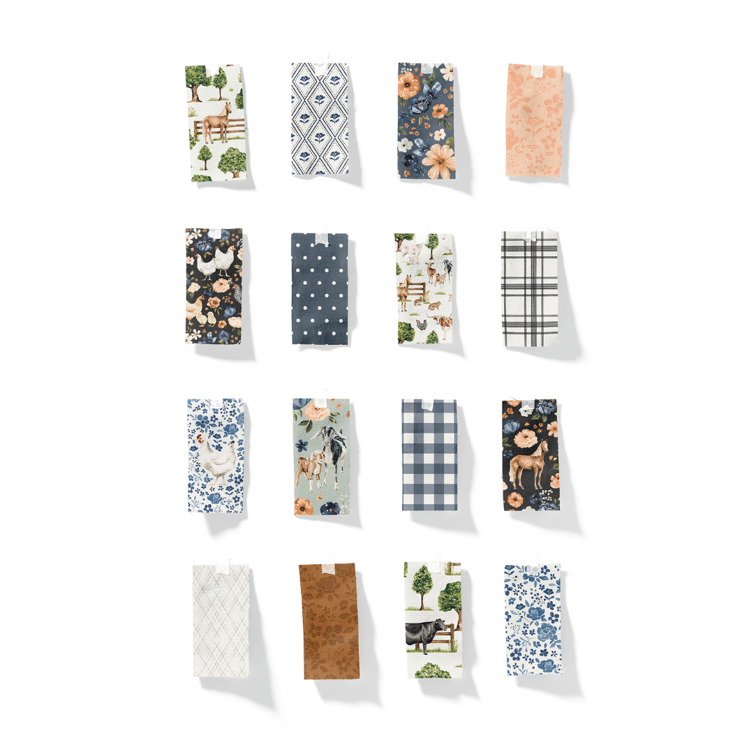 Farm & Meadow is a nod to the timeless simplicity of the idyllic country life. A collection inspired by country meadows, quiet ponds, shade trees and the farm animals that live there. Hand-painted, watercolor farm animals, trees and florals combined with simple, timeless coordinates make pattern combinations possibilities endless!